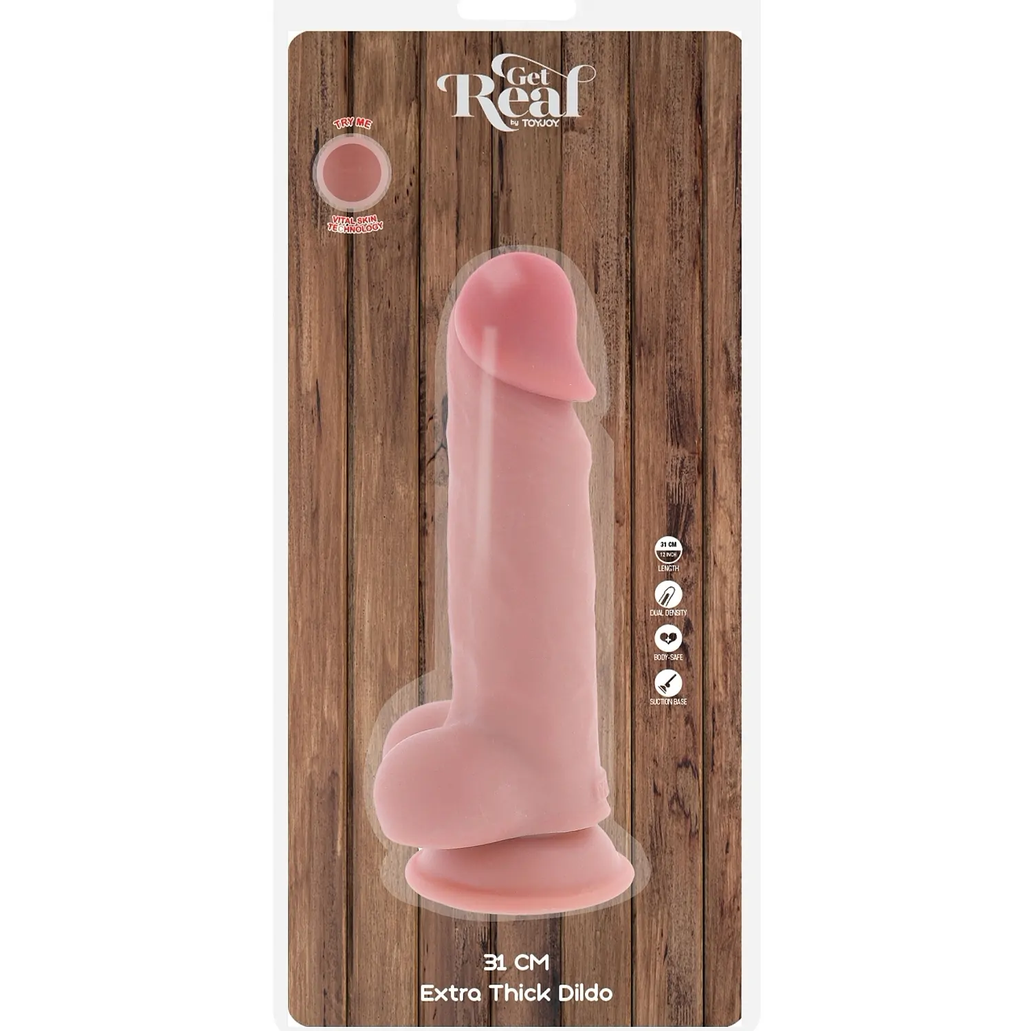 Replică reală Get Real Deluxe de la ToyJoy, dual-densitate, 31 cm, inserabil 25,5 cm și diametru 7 cm. Suprafață Supreme Skin TPE, bază cu pompă pentru utilizare hands-free. Compatibil cu lubrifianți pe bază de apă; spălare ușoară cu apă caldă și săpun.