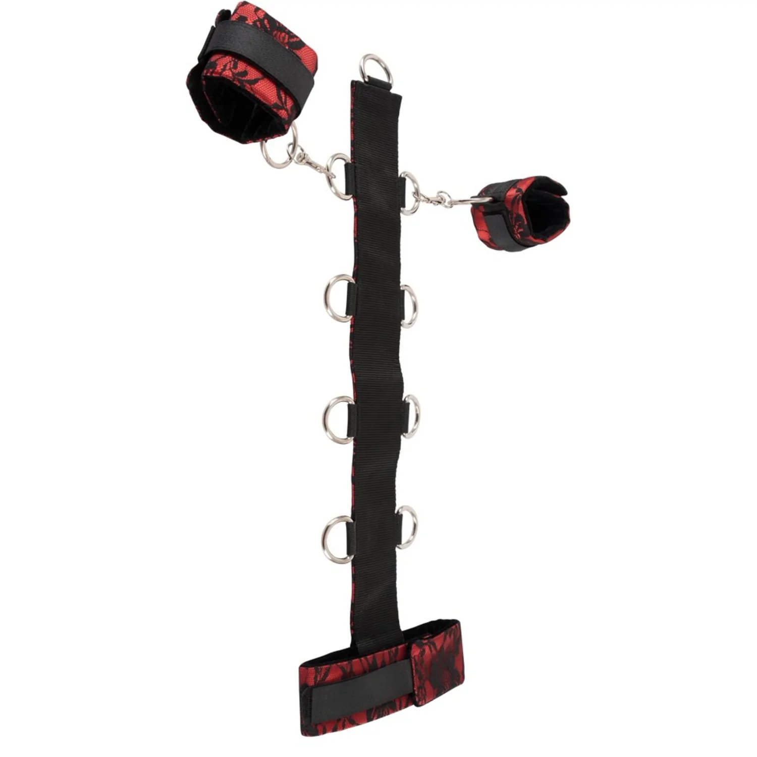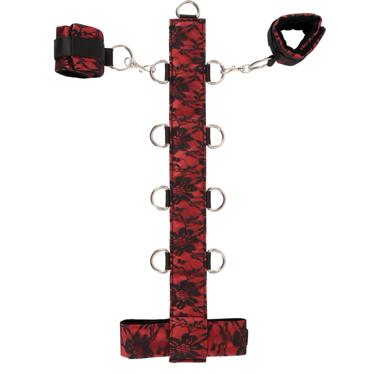 Beneficii și atribute: - Estetică elegant: satin roșu combinat cu dantelă neagră - Interior din catifea pentru confort la purtare - Prindere reglabilă cu velcro pentru ajustare precisă - Cătușe cu cârlige rapide pentru montare/demontare facilă - Material 100% poliester: durabil și ușor de întreținut