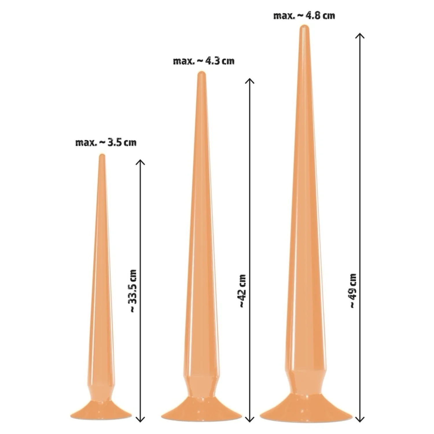 Detalii pe mărimi: - Mic: lungime totală 33.5 cm, extindere inserabilă 32 cm, calibru 1–3.5 cm, greutate 161 g - Mediu: mărime deplină 42 cm, lungime inserabilă 40.5 cm, diametru 1–4.3 cm, greutate 268 g - Mare: lungime globală 49 cm, lungime inserabilă 46 cm, diametru 1.5–4.8 cm, greutate 453 g