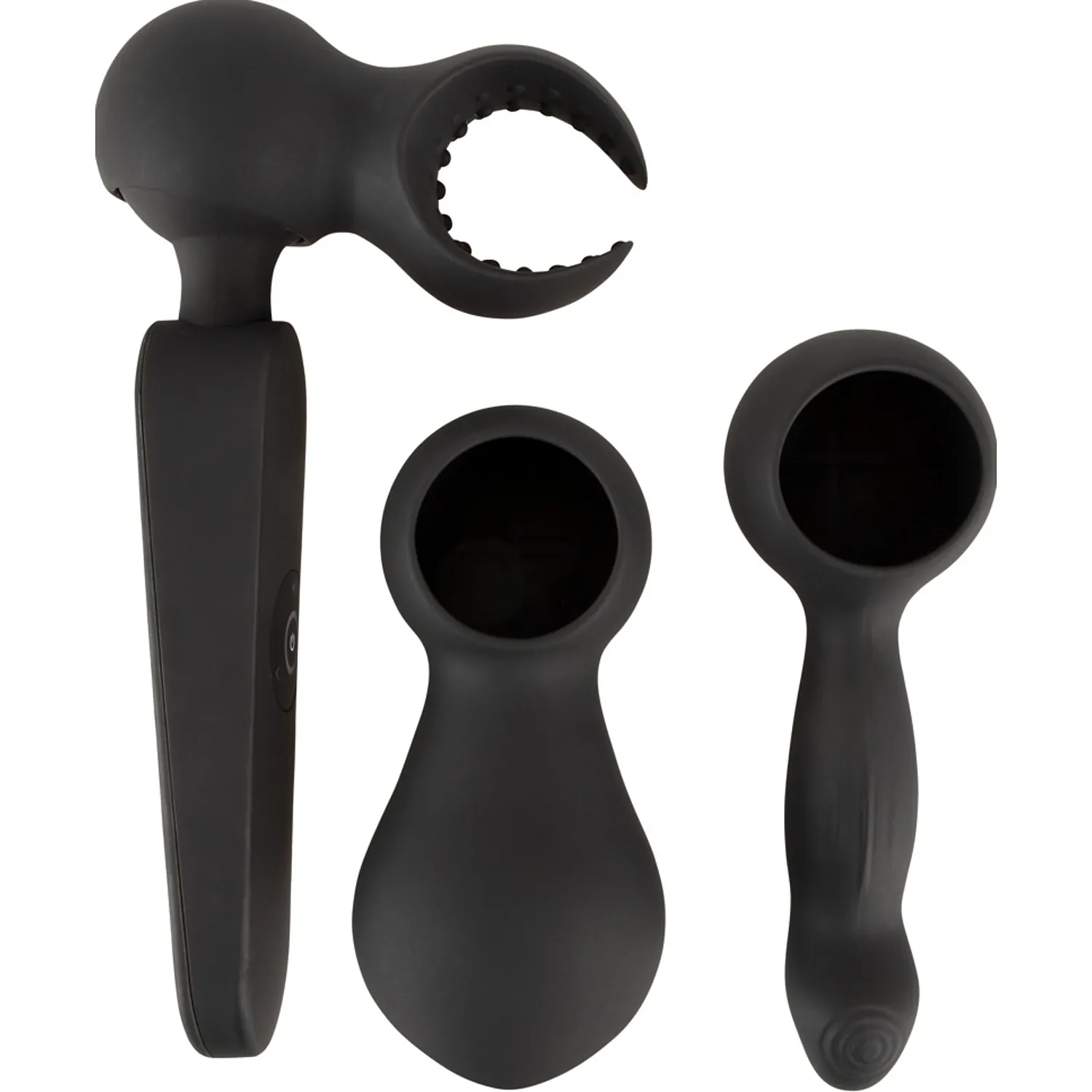 Setul include trei podoabe moi interschimbabile: dildo texturat (16 cm total, inserabil 10,5 cm, calibru max. 2,8 cm), masturbator închis cu texturi (13,5 cm, adâncime inserabilă 8,5 cm) și masturbator deschis flexibil (11,5 cm, diametru 3,8 cm). Accesoriile se montează ușor și sunt concepute pentru masaj extern și întrebuințare intimă.