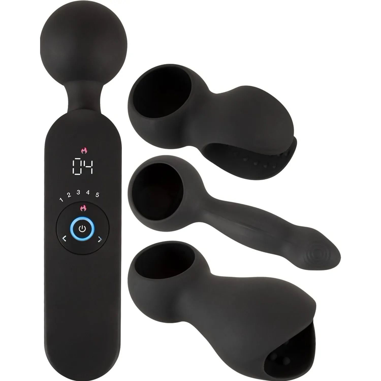 Setul conține trei podoabe moi interschimbabile: dildo texturat (16 cm total, inserabil 10,5 cm, calibru max. 2,8 cm), masturbator închis cu texturi (13,5 cm, adâncime inserabilă 8,5 cm) și masturbator deschis maleabil (11,5 cm, diametru 3,8 cm). Accesoriile se montează ușor și sunt gândite pentru masaj extern și utilizare intimă.