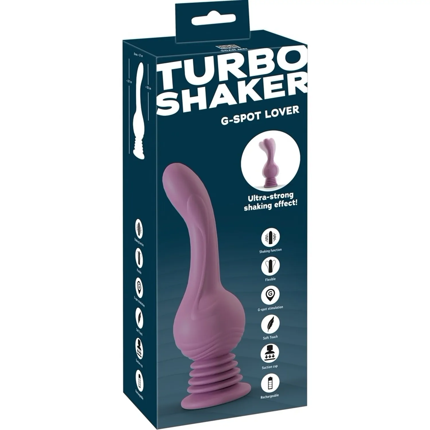 Turbo Shaker G-Spot Lover de la You2Toys este un mecanism ingenios, cu o configurație îndoită perfectă, ce oferă vibrații dominante și stimulante. Motorul său avansat generează mișcări oscilante printr-o bilă rotativă, iar intensitatea poate fi ajustată în trei trepte. Cu un suport de ventuză maleabil și o arie din silicon catifelată, se adaptează facil oricărei utilizări. Reîncărcabil, inclusiv cablu USB.