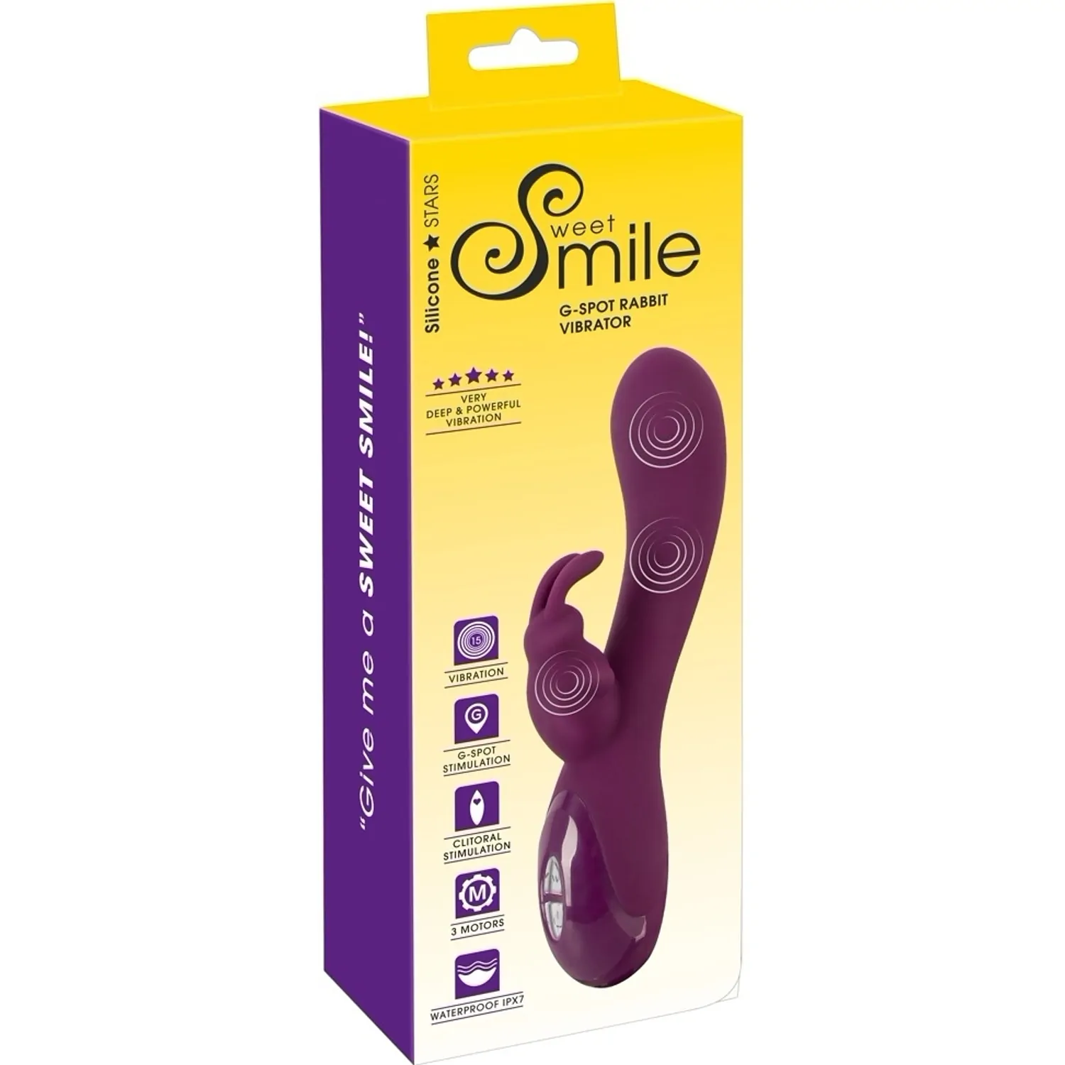 Sweet Smile Rabbit: dublu vibrator reîncărcabil cu 15 moduri și 3 motoare. Carcasă din silicon catifelat, design încovoiat pentru stimulare punctului G și clitorisului simultan. Impermeabil, USB inclus, control intuitiv.