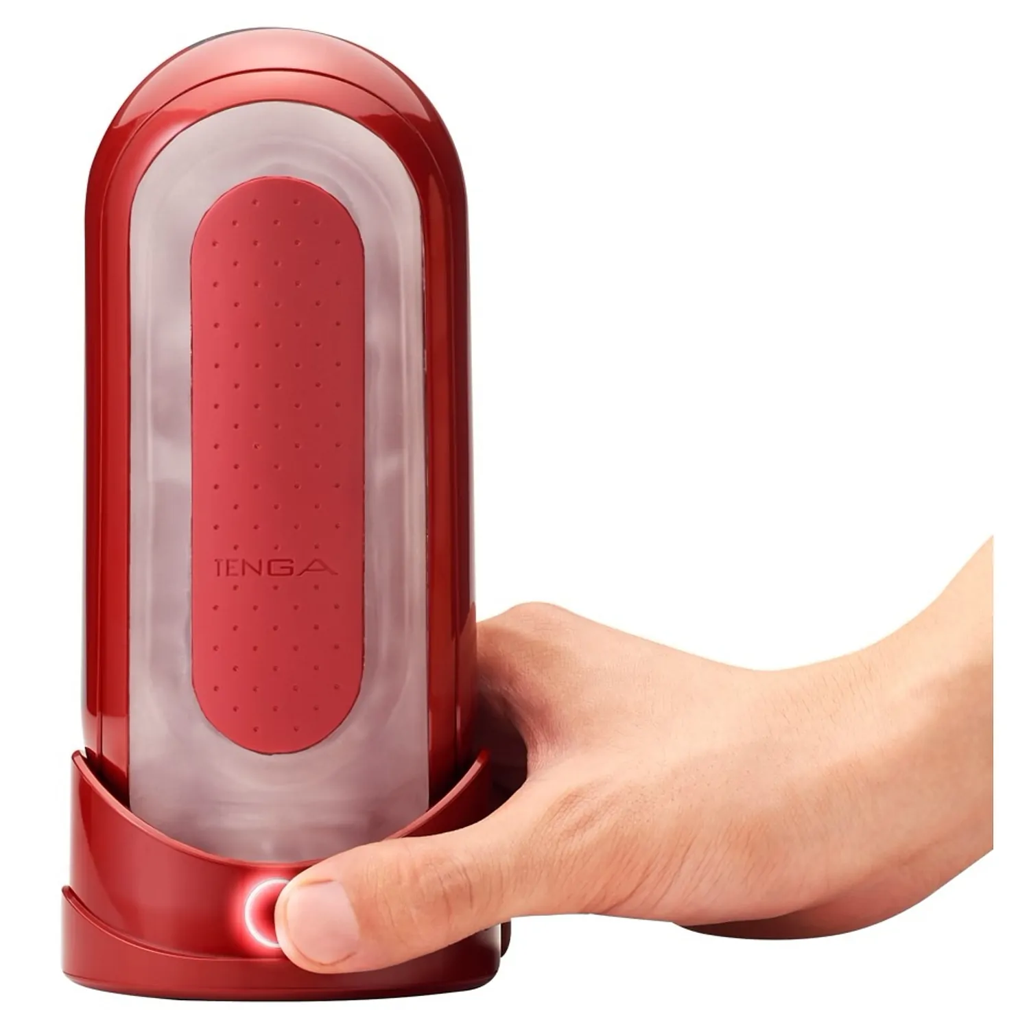 Setul Tenga FLIP 0 Red cu FLIP WARMER combină un cilindru pliabil din gel moale, cu detalii interne dense, și un încălzitor dedicat care uniformizează temperatura dinspre punctul de inserție spre profunzime.