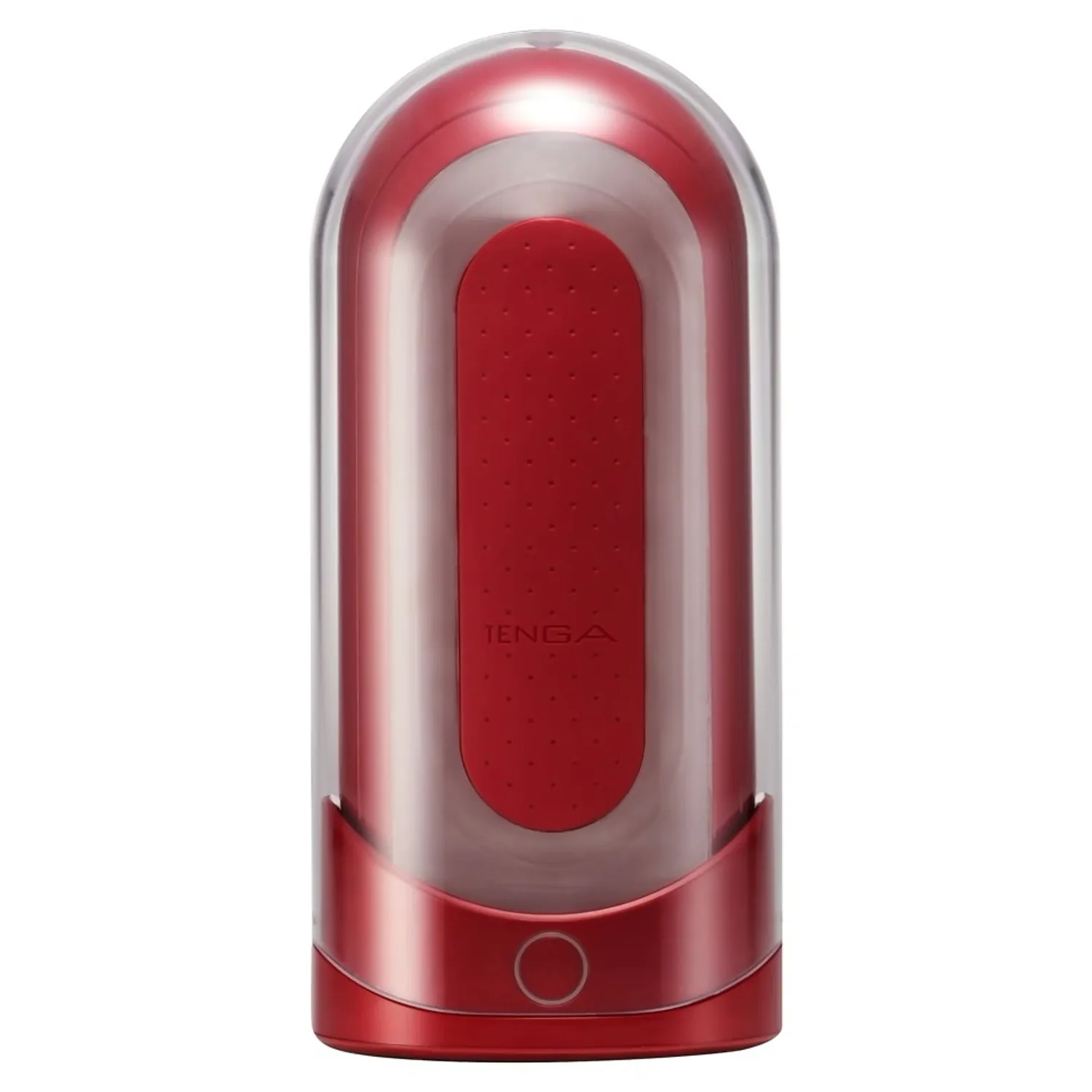 Set Tenga FLIP 0 Red cu încălzitor FLIP WARMER: cilindru din gel moale cu texturi dense, încălzire în 5–6 minute, două trepte, design pliabil pentru ștergere accesibilă și suport pentru uscare. Include adaptor, carcasă și 2 mostre lubrifiant.