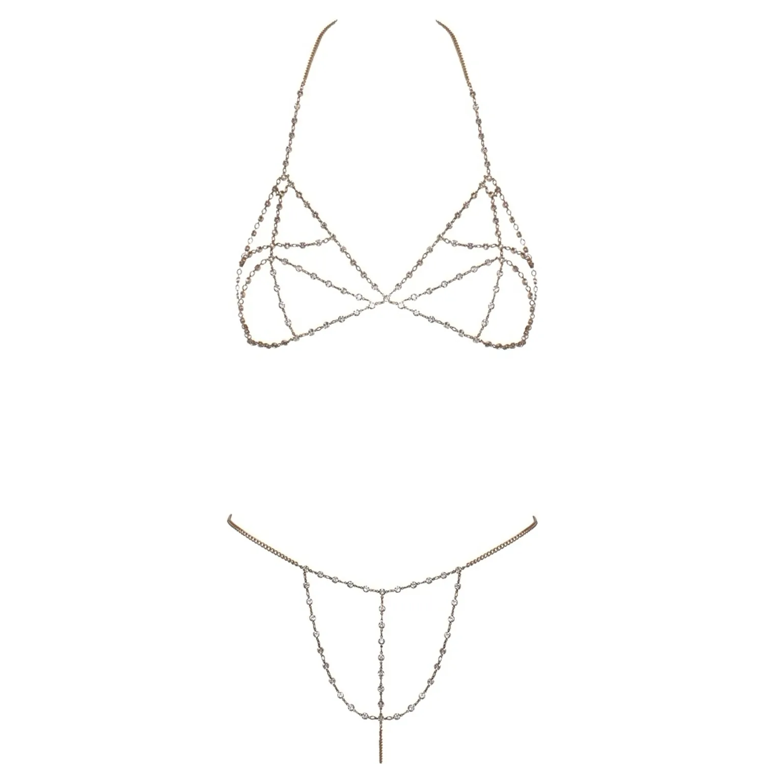Beneficii și caracteristici: - Set 2 piese: sutien + tanga - Lanțuri metalice cu ștrasuri strălucitoare - Barete reglabile cu 3 închizători la gât și spate - Poate fi purtat ca accesoriu peste haine sau individual - Mărime: S-L - Culoare: auriu-argintiu