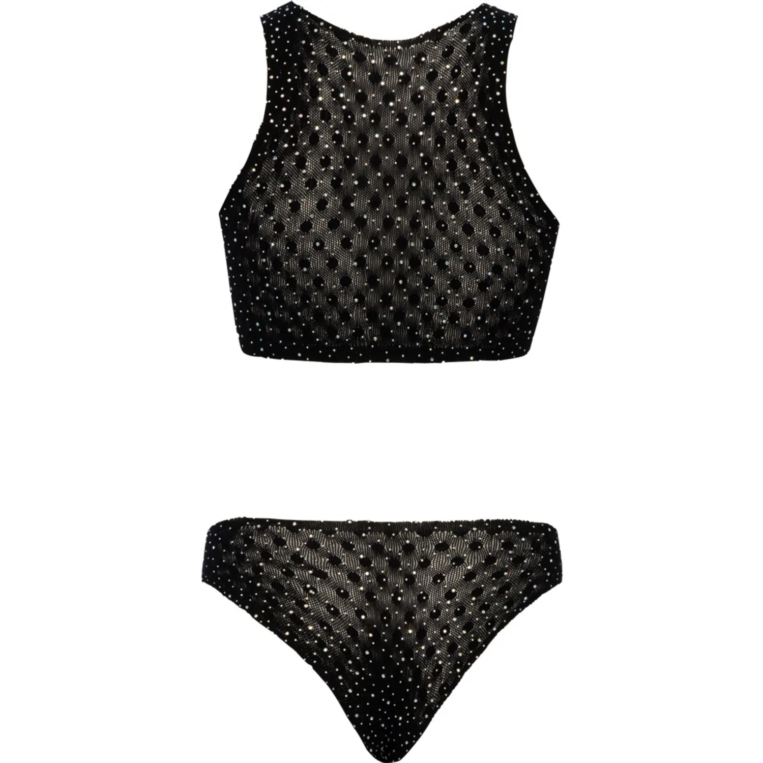 Beneficii şi atribute: - Top cu decupare la decolteu, accent vizual discret - Material semitransparent şi elastic, care se mulează plăcut - Strasuri mari aplicate pentru un finish strălucitor - Construcţie excluzând cusături evidente pentru confort sporit - Mărime universală S-L, uşor de purtat - Set 2 piese: top + tanga - Compoziţie clară: 93% poliamidă, 7% elastan - Culoare: obscur Acest construit este lucrat dintr-un material elastic.