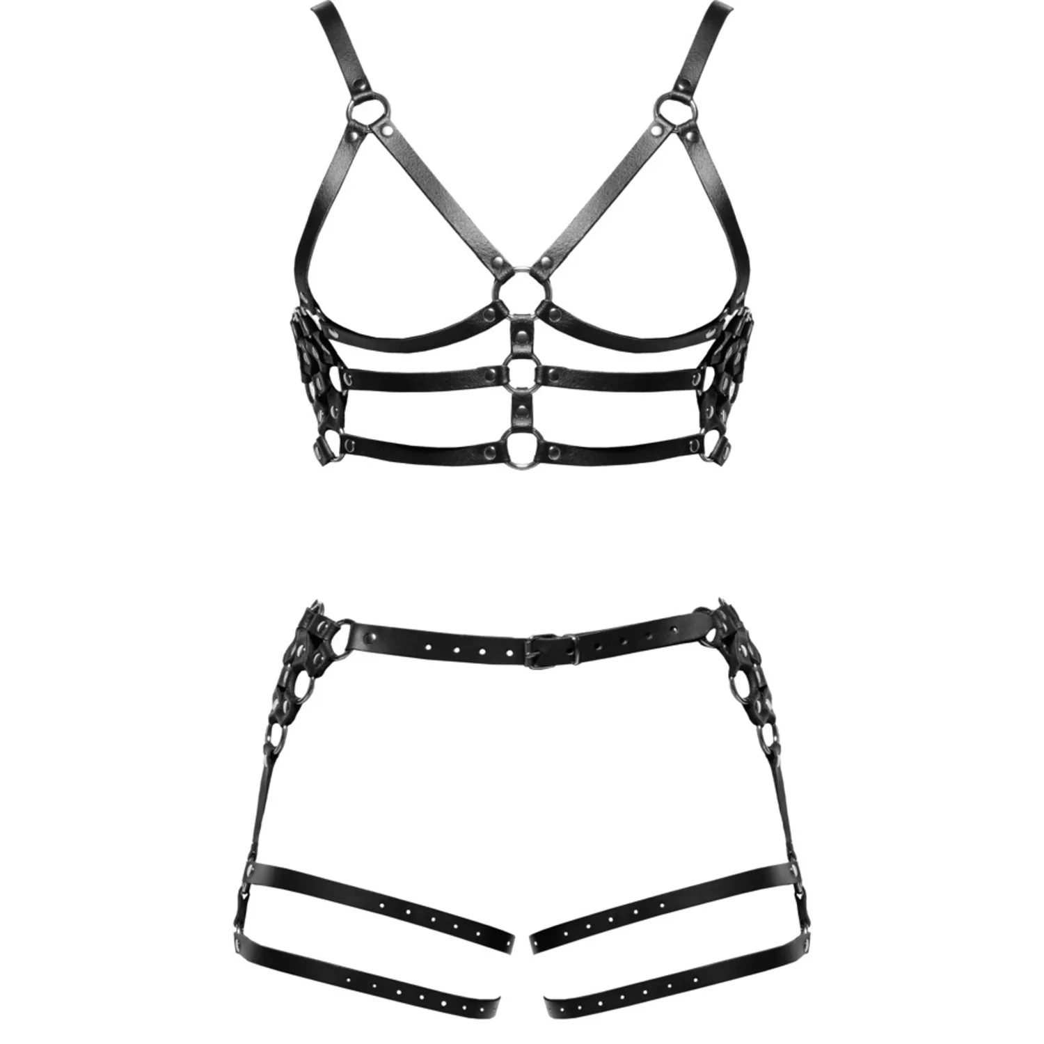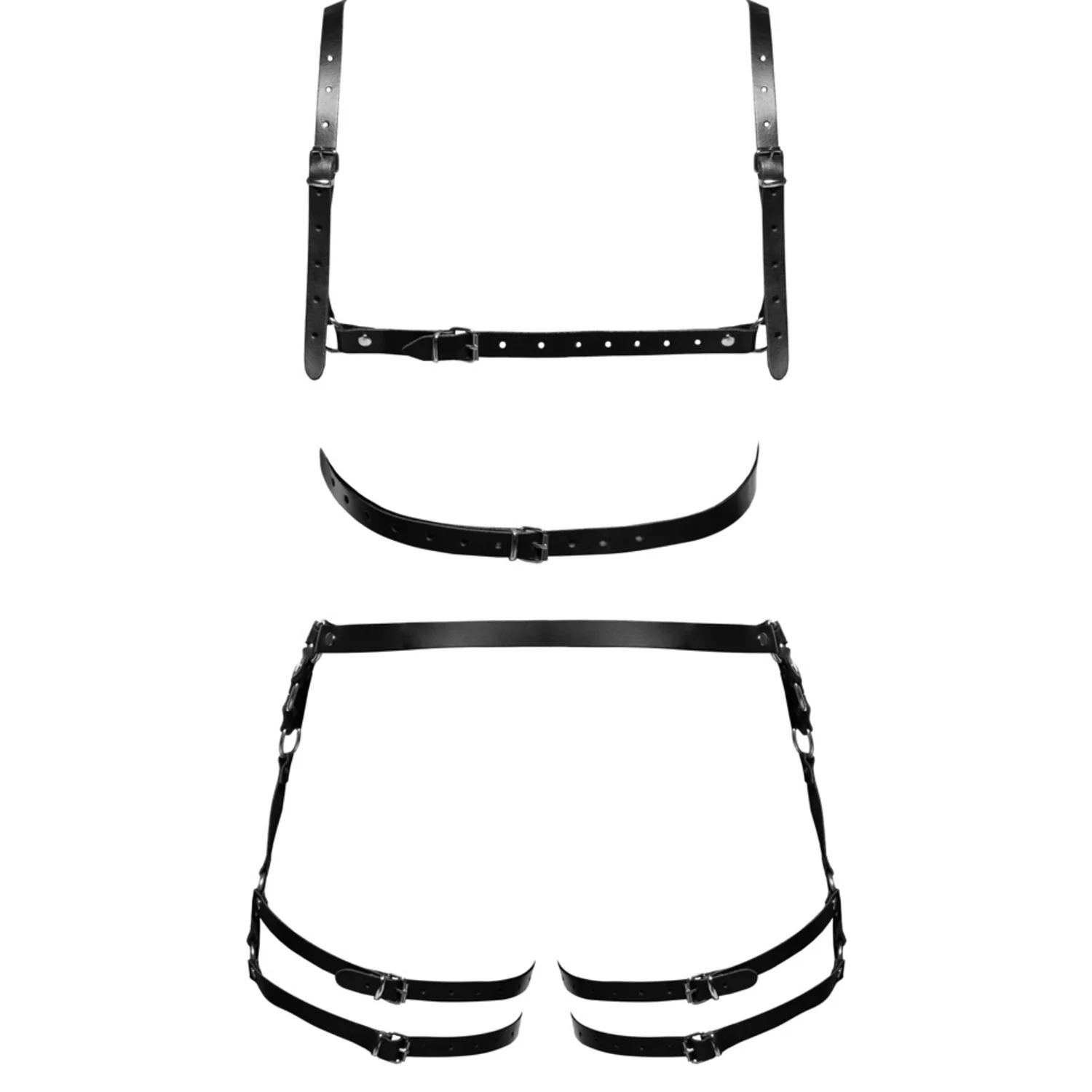 Set hamuri din piele ZADO, reglabile, negru: ham pentru piept și șold cu chingi fixe pe coapsă, catarame metalice pentru ajustare și prindere sigură. Tegument split (cowhide), tăbăcită privat de crom, acoperire poliuretanică; confort și stabilizare stabilă.