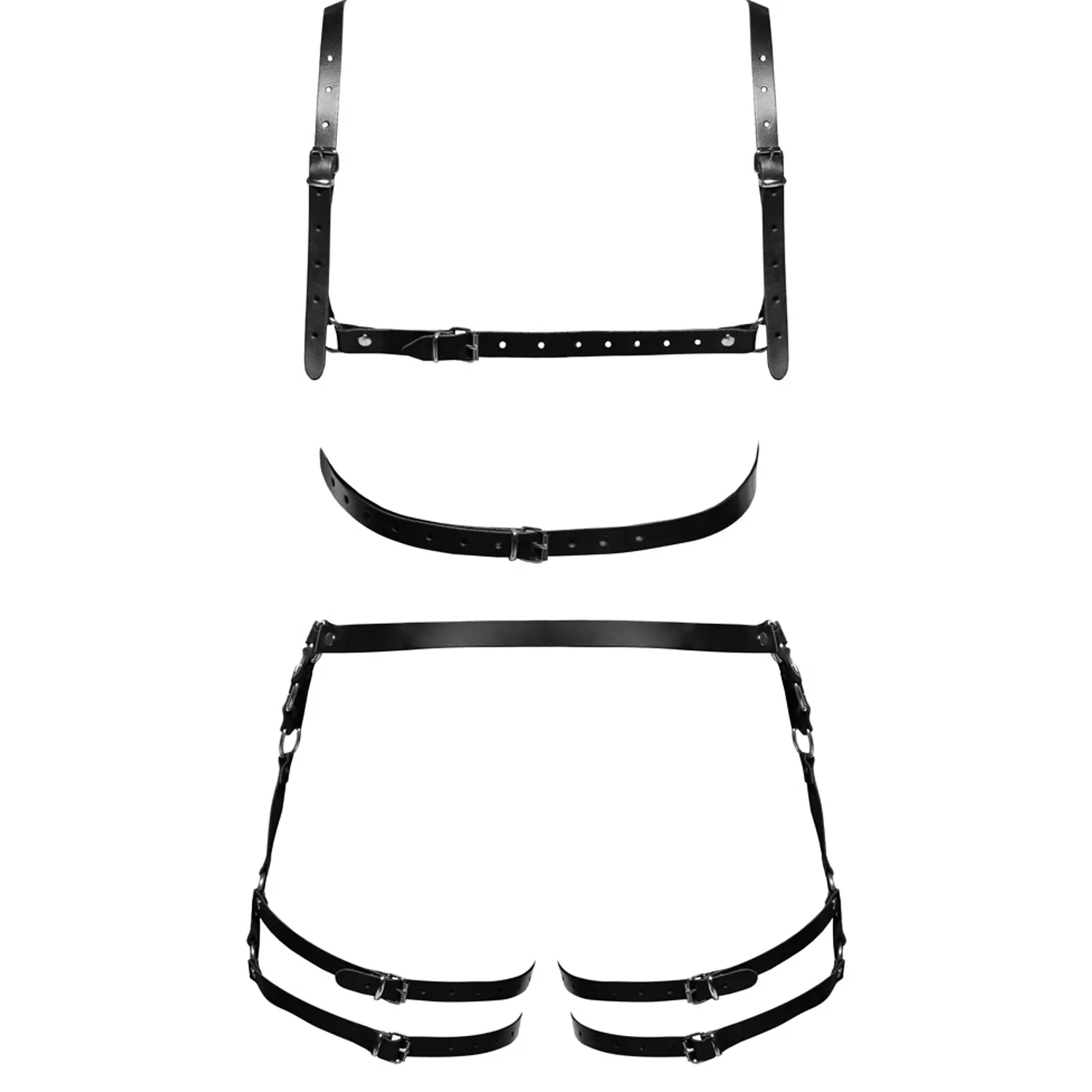 Set hamuri din piele ZADO, reglabile, negru: ham pentru piept și șold cu chingi fixe pe coapsă, catarame metalice pentru ajustare și prindere sigură. Epidermă split (cowhide), tăbăcită fără crom, acoperire poliuretanică; confort și fixare stabilă.
