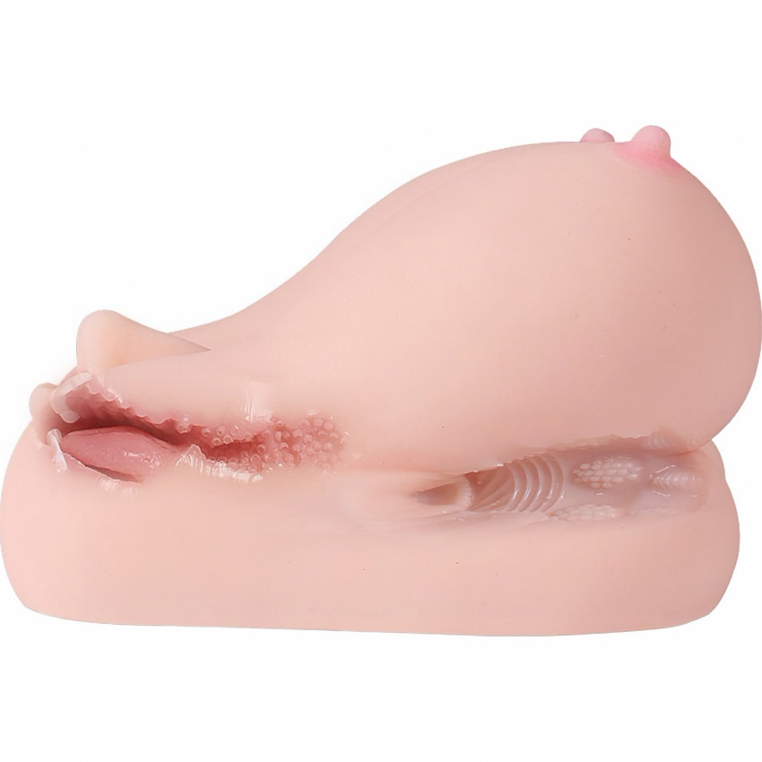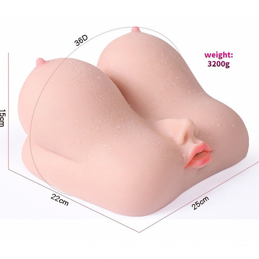 Deschiderea orală este lucrată cu atenție, incluzând limbă și dinți pentru senzații variate. Greutatea de 3,2 kg oferă stabilitate în timpul utilizării, păstrând materialul finit ferm poziționat.