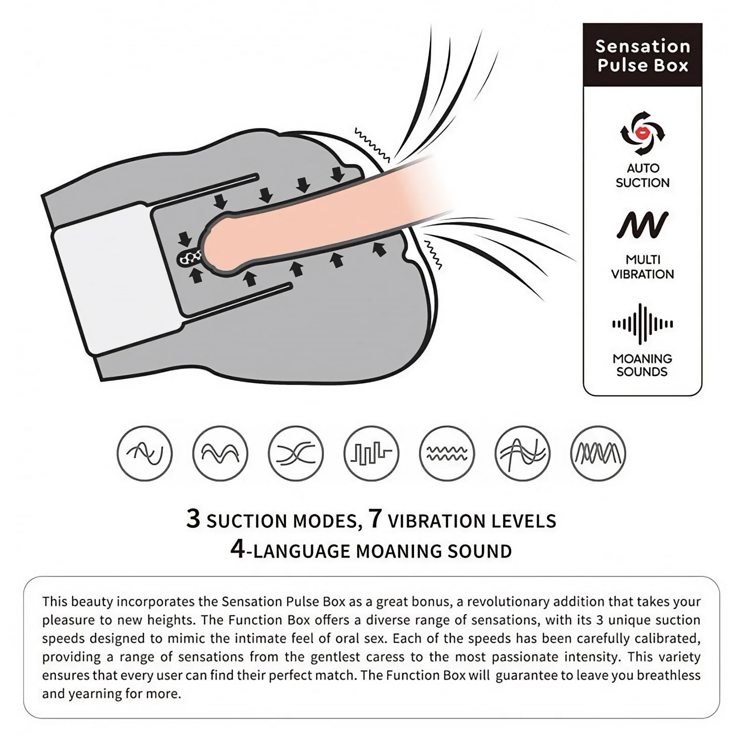 Beneficii și atribute: - 3 trepte de aspirație pentru reglaje subtile sau mai intense - 7 frecvențe de vibrație pentru variație tactilă - Sunete realiste integrate pentru un plus de naturalitate - Canal detașabil din TPE, fără greutate de curățat - Carcasă din ABS, edificare solidă - Reîncărcabil, compact și ușor de depozitat