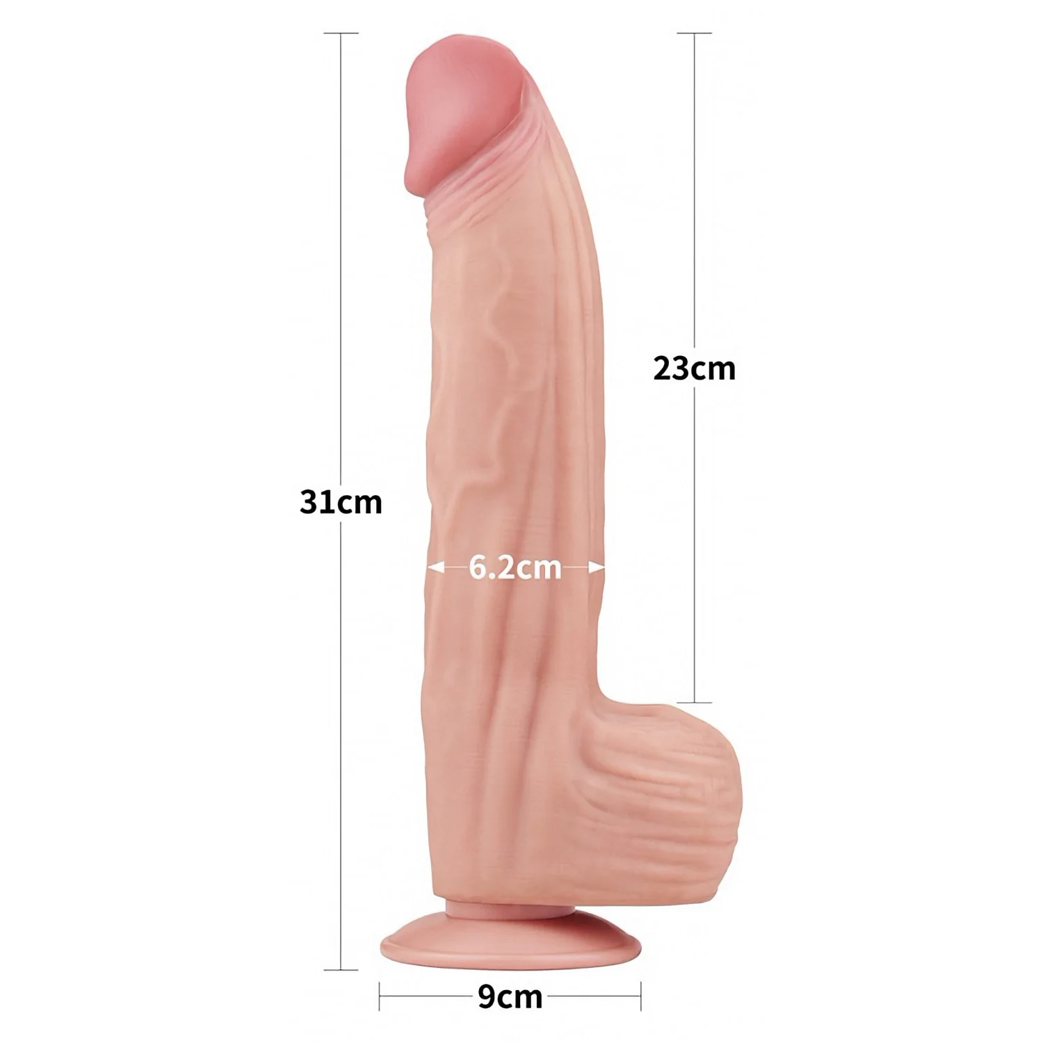 Jucărie realistică din TPE cu dublu strat, 31 cm lungime şi diametru 6,2 cm. Exterior moale, miez ferm şi foarte flexibil, cu cupă detaşabilă pentru fixaj stabilă. Compatibilă cu lubrifianţi pe bază de apă; se curăţă uşor.