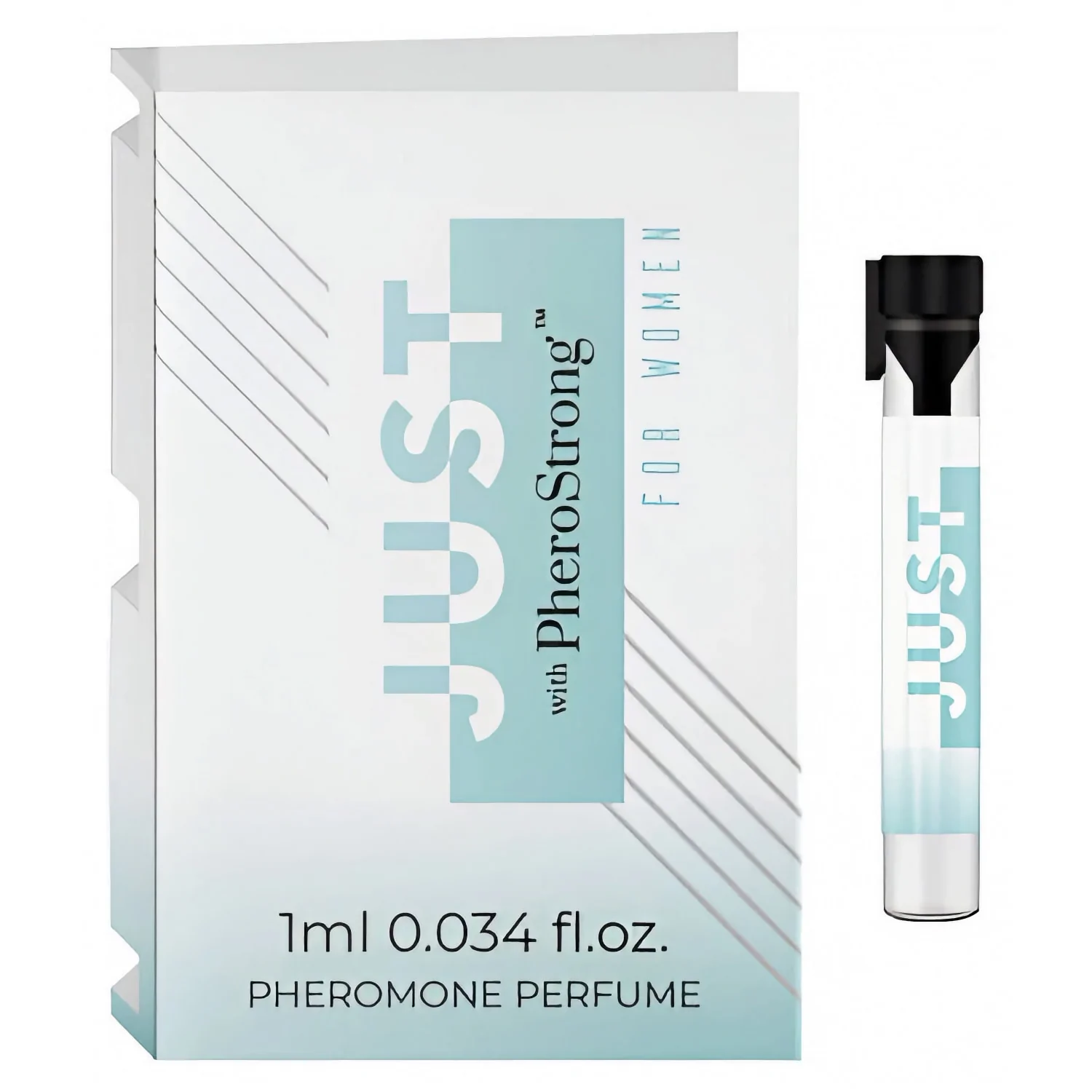 Parfum floral-chypre PheroStrong Just for Women, 1ml — note de piper, hyacinth, iris și iasomie, bază caldă de patchouli, mosc, vanilie și chihlimbar. Formula discretă, persistentă, perfectă pentru uz zilnic și momente speciale.