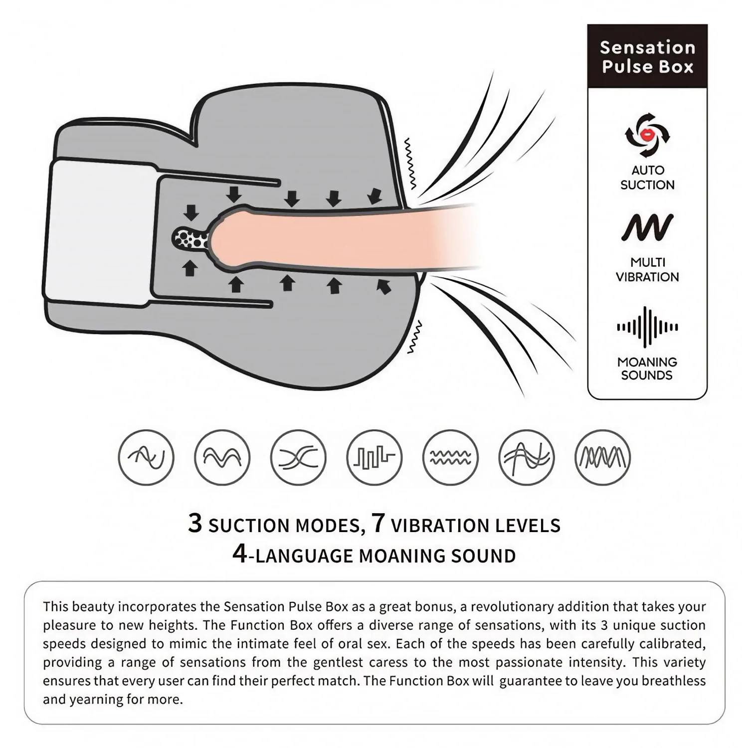 Beneficii și atribute: - Canal intern realist, texturat pentru stimulare variată - 3 viteze de aspirație pentru reglaje distincte - 7 frecvențe de vibrație pentru varietate - Sunete realiste integrate pentru stârnire audio discretă - Unitate de control detașabilă pentru curățare ușoară - Carcasă robustă din ABS și interior din TPE - Dimensiuni compacte: 19.7×20×14 cm, culoare negru