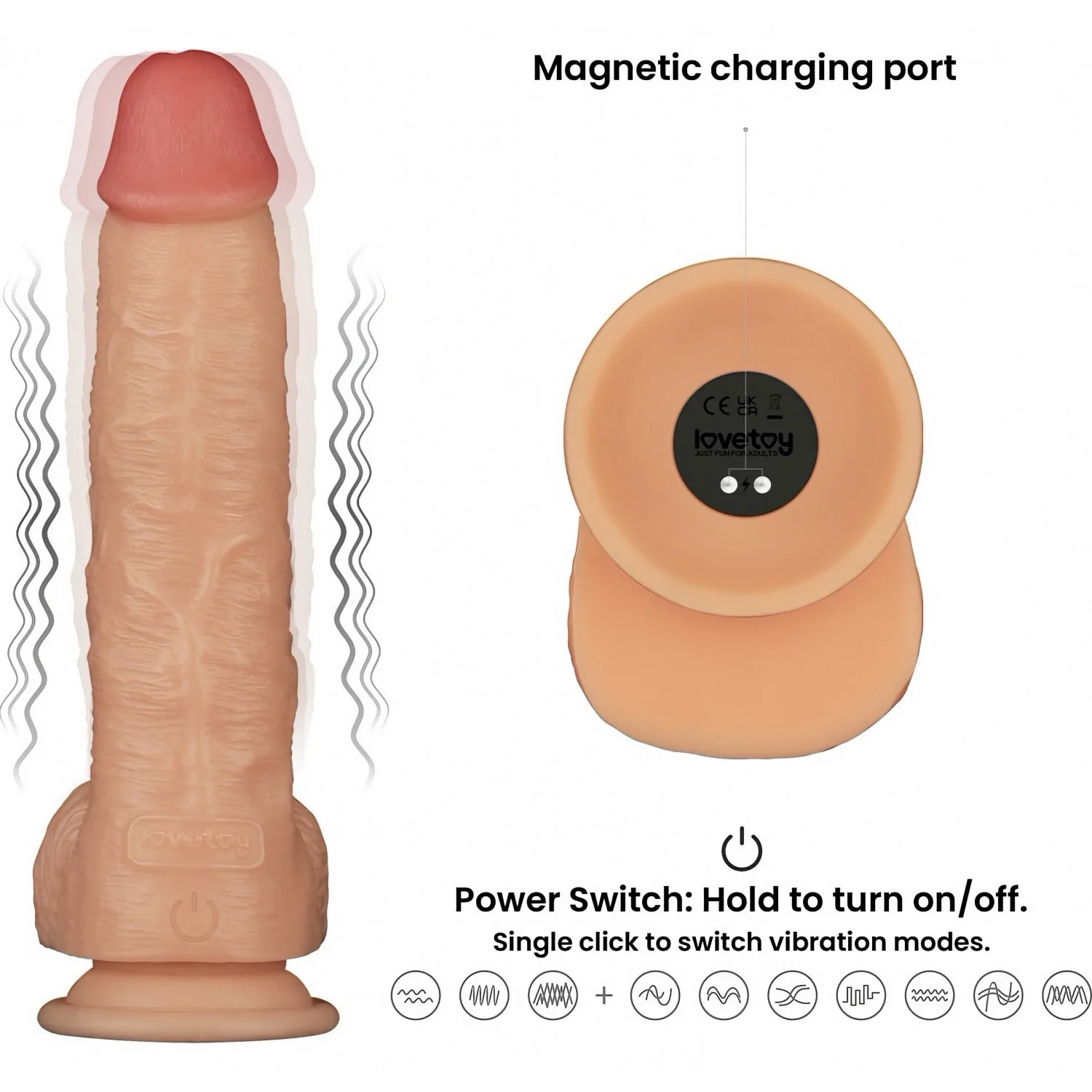 Baza robustă cu ventuză garantează fixare stabilă pe suprafețe netede pentru distracție hands-free și este compatibilă cu hamuri pentru utilizări alternative. Produsul este reîncărcabil și fabricat din PVC, cu nuanță potrivită pentru un înfățișare natural.