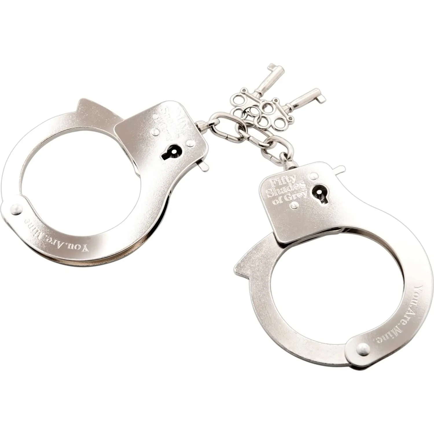 Gravate cu logo și cu You Are Mine (Ești A Mea). Rezistente și sigure. 2 chei incluse, plus o pârghie de deblocare de securitate pentru orice eventualitate.