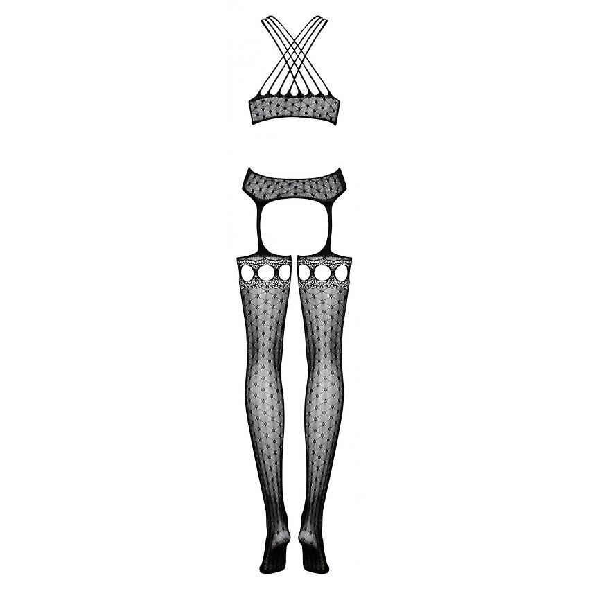 - bogat decorat cu motive geometrice - 2 în 1 - top și ciorapi - bretele încrucișate la decolteu - deschideri verticale pe abdomen - efect de subțiere optică! - design incitant! - coapsele sunt împodobite cu decupaje rotunde - spatele deschis accentuează curbele atrăgătoare - material pufos și elastic