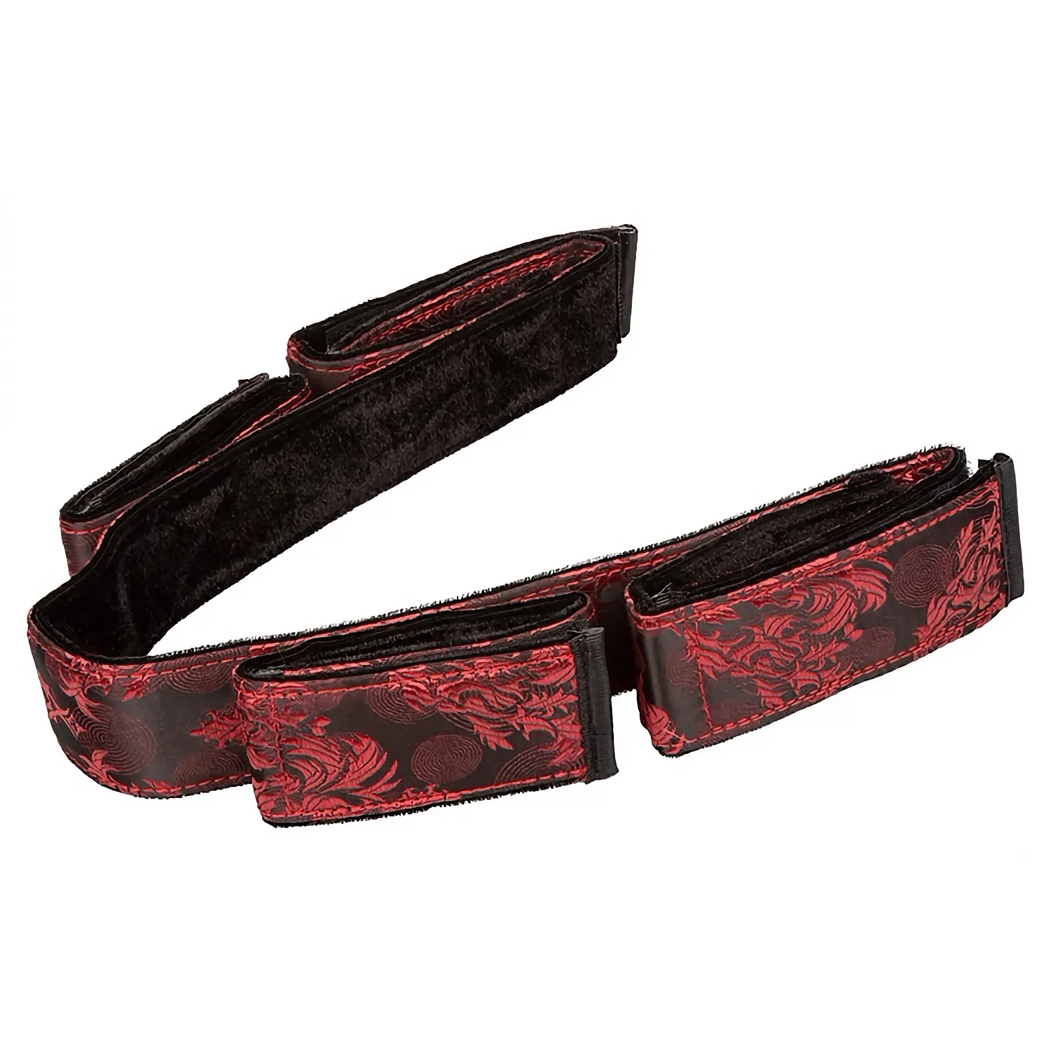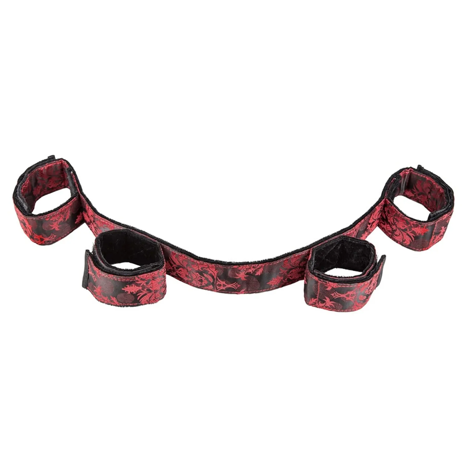 Curea despărțitoare ajustabilă la încheieturi și la glezne. Are și o parte plușată pentru confort și o parte cu tip pe material. Se prinde cu arici. Patru manșete de lux sunt conectate la o bară de stil flexibilă pentru a lega strâns încheieturile și gleznele în poziții delicate expuse. Predați-vă oricărui capriciu al iubitului vostru.