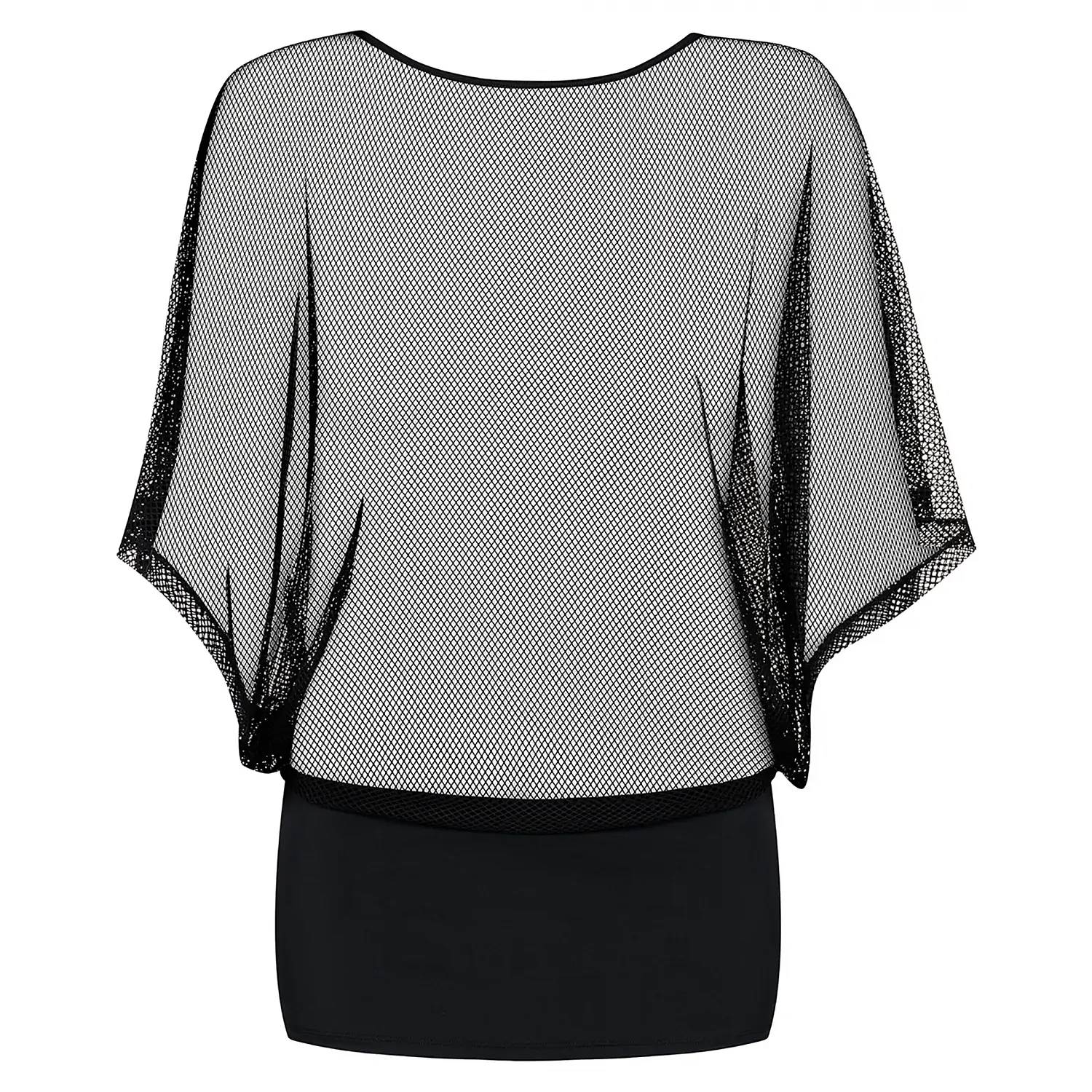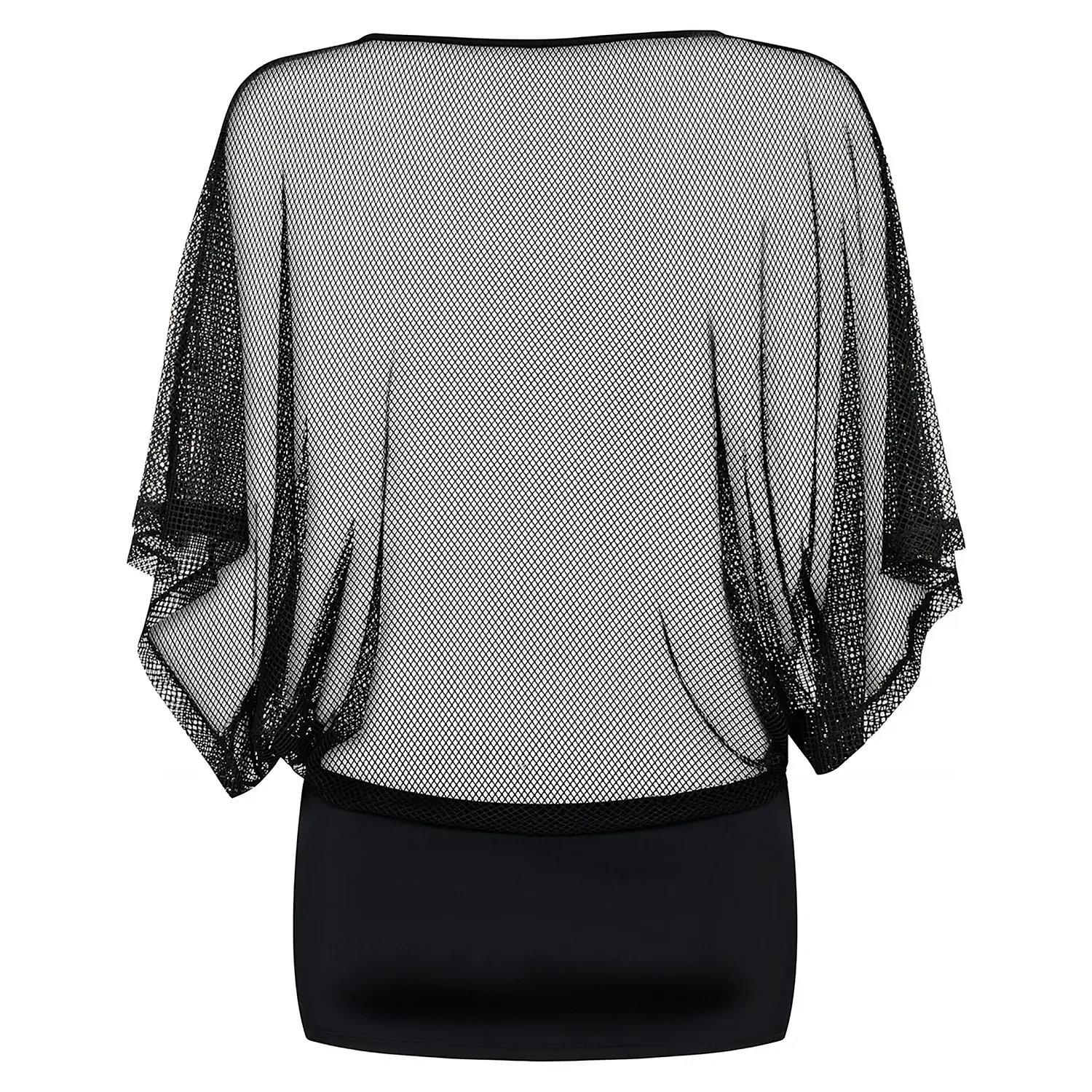 Un chemise incitant de tentă neagră cu care îți vei surprinde în mod simpatic partenerul. În partea de sus este realizat dintr-un material tip plasă, cu croiala largă, iar partea de jos tip fustiță mini este realizat dintr-un material elastic ușor la atingere. Bikini-ul chilot cu ață adăugat completează desăvârșit ținuta. Produsul este fabricat dintr-un material cu trăsături elastice.